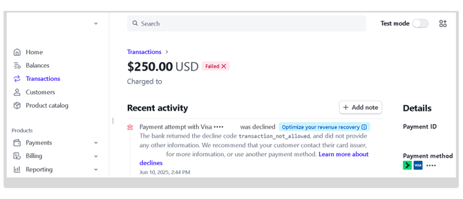 | Failed Transaction | Processor or bank record showing the payment failed or was not authenticated. |