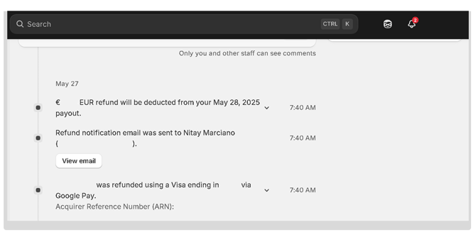 | Previously Refunded | Refund date and confirmation showing it was processed before the alert. |
